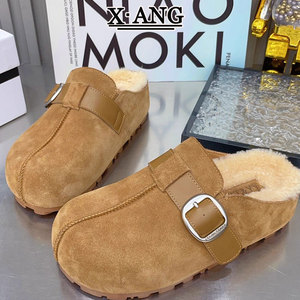牛皮版厚底勃肯鞋羊羔毛毛鞋女棉拖鞋2025新款秋冬包头半拖鞋外穿