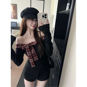 甜辣妹格纹拼接一字肩T恤女2025秋季新款蝴蝶结修身显瘦长袖上衣