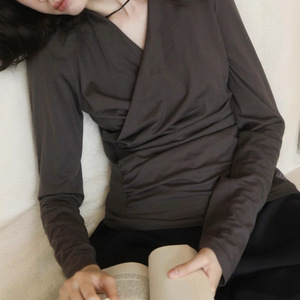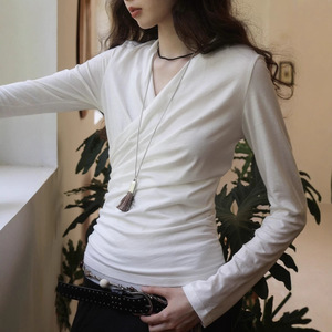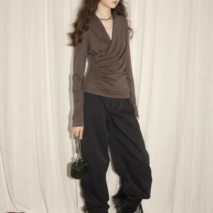 奥地利莫代尔羊毛混纺轻盈柔软透气v领堆褶收腰显瘦长袖上衣