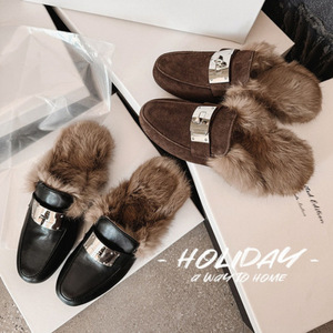 法式复古包头半拖鞋女2025新款秋冬加绒兔毛保暖棉拖鞋毛毛穆勒鞋