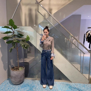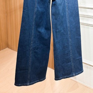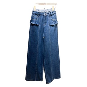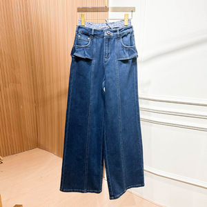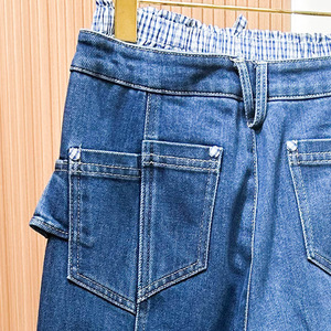 2025秋冬季新款时尚格子腰头拼接撞色高腰水洗直筒牛仔长裤休闲裤