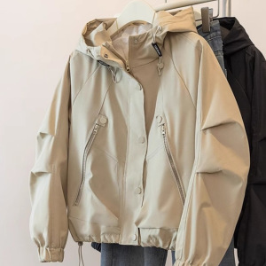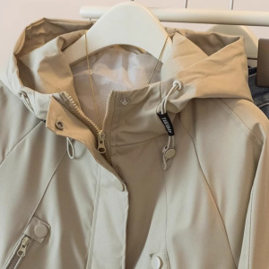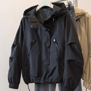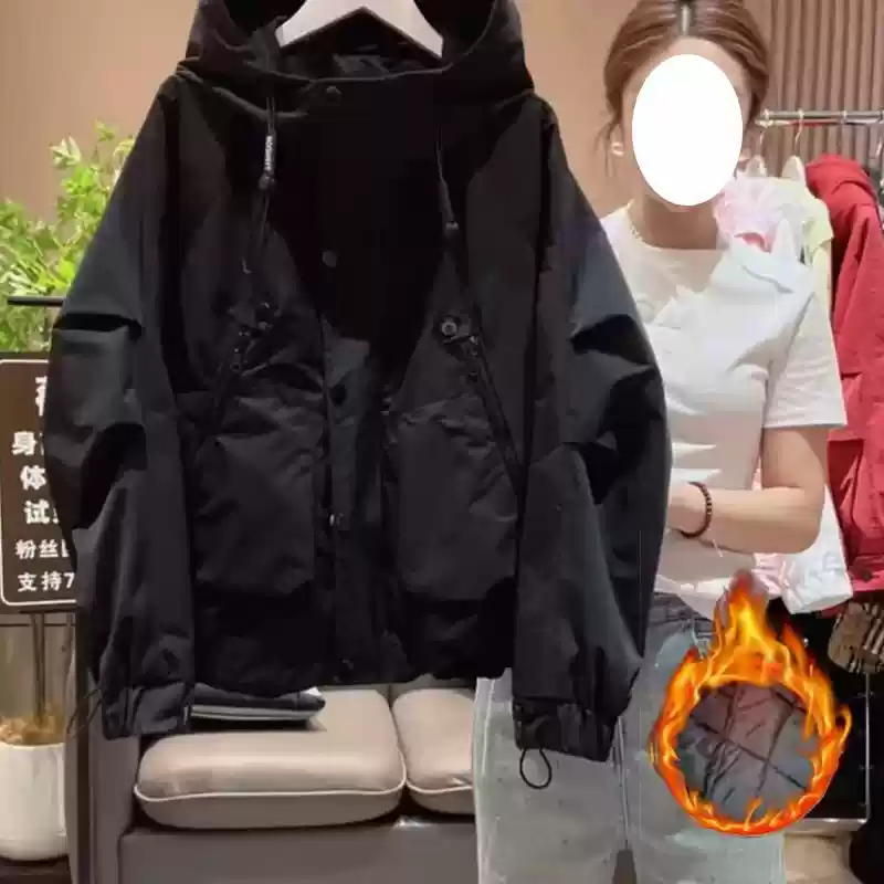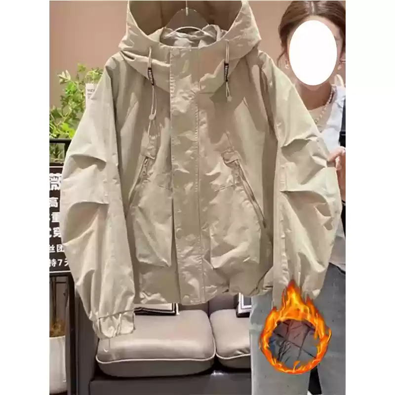 大码时尚休闲连帽工装外套女早秋新款微胖mm宽松风衣夹棉加厚上衣