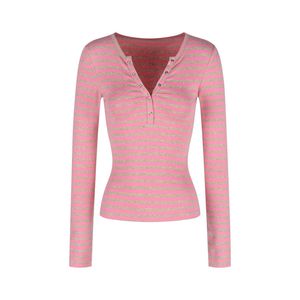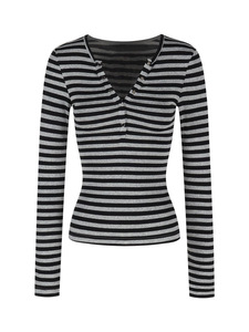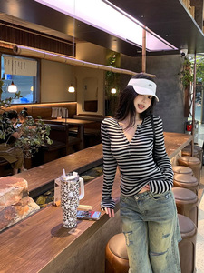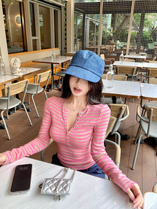 设计感撞色条纹长袖T恤女春秋季修身收腰内搭打底纯欲半开领上衣