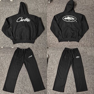 新款美潮印花加绒连帽卫衣男女情侣拉链外套宽松直筒长裤运动套装