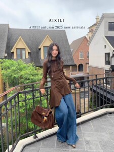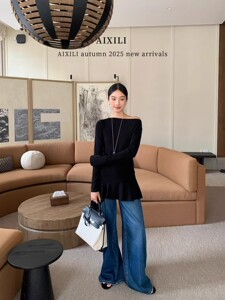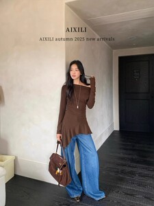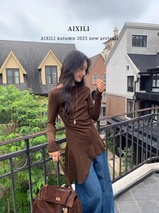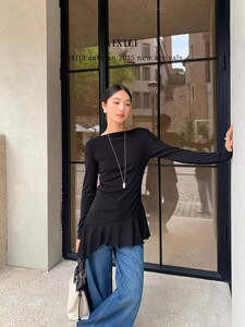 韩版气质不规则下摆长袖T恤女秋季新款高级感中长款斜肩收腰上衣