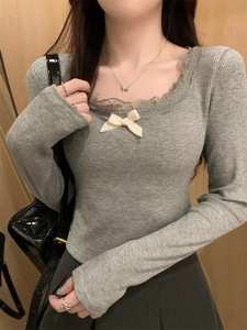 蝴蝶结蕾丝拼接长袖T恤女秋冬修身短款德绒打底衫内搭纯欲风上衣