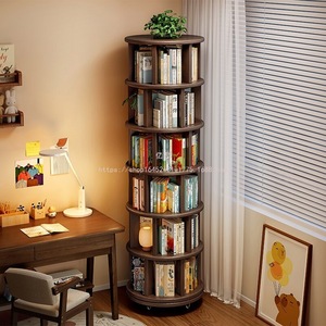 亿君实木旋转书架360度落地移动置物架一体靠墙边小窄柜家用转角