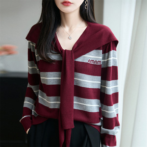 法式披肩撞色条纹针织毛衣女时尚宽松长袖叠穿毛衫洋气减龄打底衫