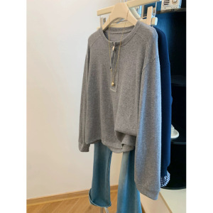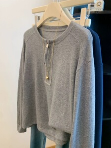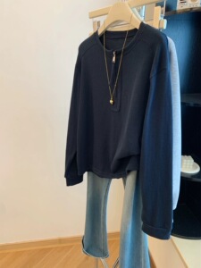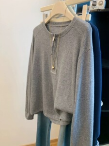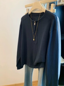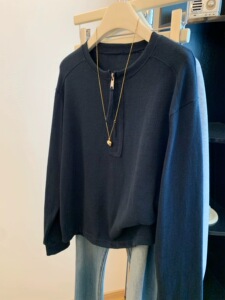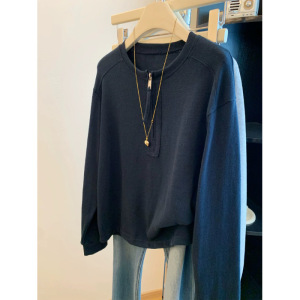 跨境纯色藏青色圆领半拉链纯棉长袖t恤女秋季修身显瘦上衣设计感