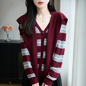 真两件2025秋冬穿搭V领披肩条纹羊毛针织衫字母宽松休闲长袖毛衣
