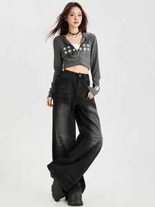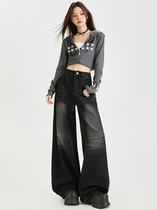 新款少女黑灰色休闲复古怀旧宽松阔腿牛仔裤女水洗拖地裤子