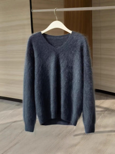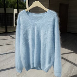 皇室拉绒100%山羊绒衫女V领秋冬拉毛打底上衣宽松套头针织衫毛衣