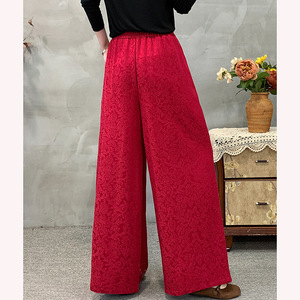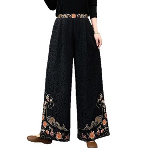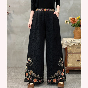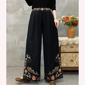 2025新款松紧腰大码显瘦休闲裤女民族风复古刺绣棉麻提花阔腿裤子