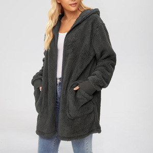 欧美保暖女式外套2025跨境新款双面毛绒连帽开衫拉条口袋防风帽衫