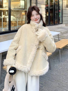 卡其色麂皮绒皮毛一体羊羔毛棉服外套女冬季设计感加绒加厚超好看