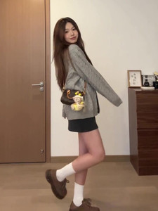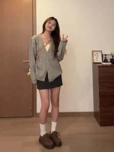 灰色慵懒风V领麻花针织开衫女2025早秋季新款宽松中长款毛衣外套