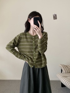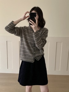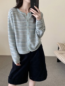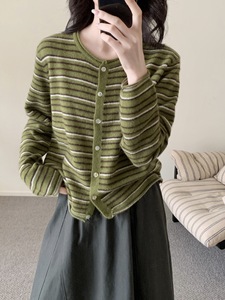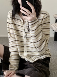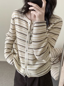 之言25秋冬女款羊毛衫韩系圆领条纹百搭氛围感贝熊绒针织开衫毛衣