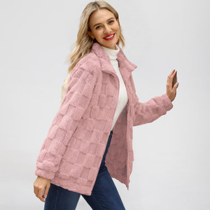 2025秋冬新款宽松女装外套欧美跨境提花方格子开衫拉链立领毛绒款