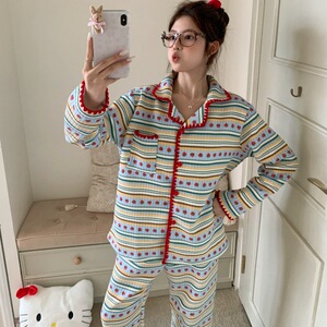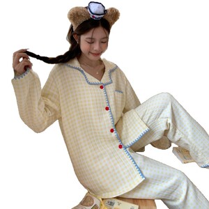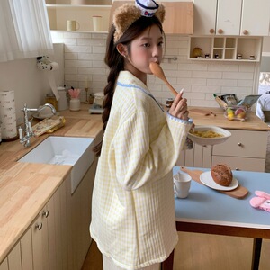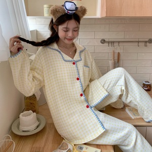 ins风睡衣女秋冬季夹层长袖开衫套装格子甜美公主风可外穿家居服