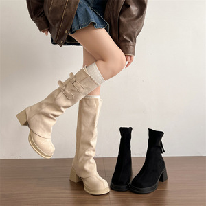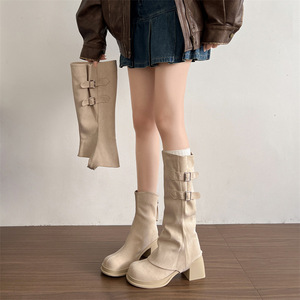 米色复古可拆卸筒靴粗跟马丁靴女2025新款春秋季增高显瘦骑士靴子