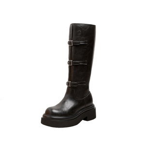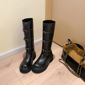 苏茵茵同款2025年时尚皮带扣骑士靴女圆头厚底百搭长靴中筒马丁靴