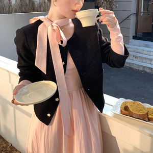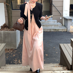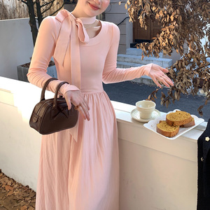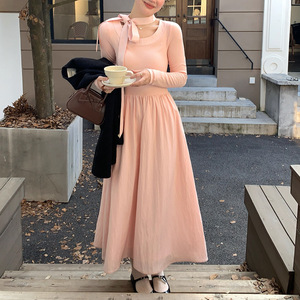 甜美【奶霜桃桃】韩版挂脖针织长袖连衣裙女温柔风收腰秋季长裙子
