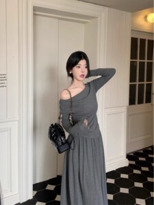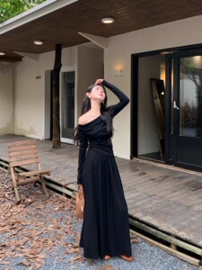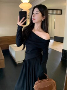 时尚气质韩系套装女秋季2025新款一字肩不规则长袖上衣垂感半身裙