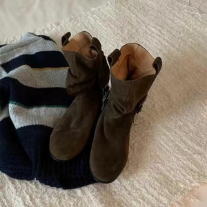 羊皮版~韩系褶皱感堆堆靴圆头平底西部牛仔靴女新款马丁靴短靴子