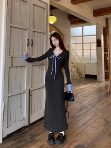 法式气质灰色v领针织连衣裙子女早秋季2025新款长袖收腰包臀长裙
