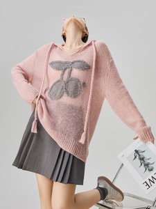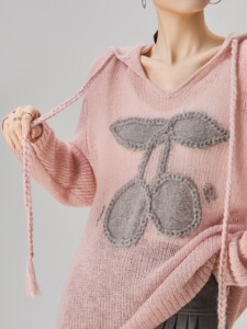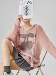 韩系氛围感粉色樱桃系带针织衫连帽毛衣女上衣巨好看的早秋季穿搭