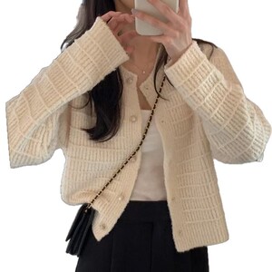 小香风纹理编织复古设计毛衣开衫纽扣宽松短款减龄感秋冬圆领长袖