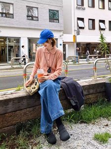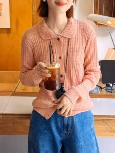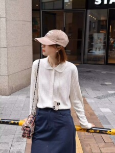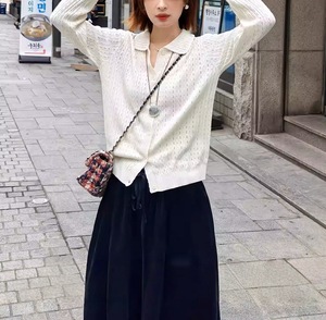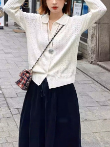 「白描」"都柏林粉雾"坑条挑孔肌理翻领针织开衫打底衫上衣