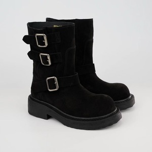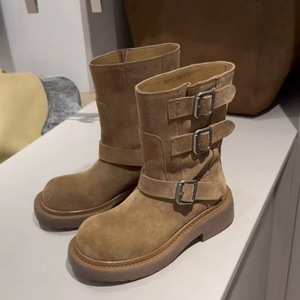 复古粗跟骑士靴女靴2025秋冬新时尚皮带扣中跟中筒靴