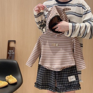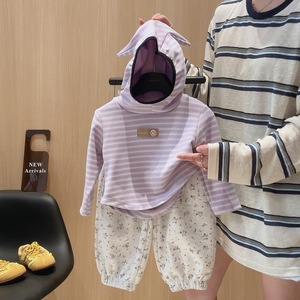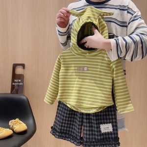 春秋款儿童德绒卫衣男女宝宝条纹长袖上衣女童可爱连帽打底衫代发