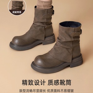 棕色裤管靴女2025秋冬新款复古百搭马丁靴厚底褶皱堆堆靴骑士短靴