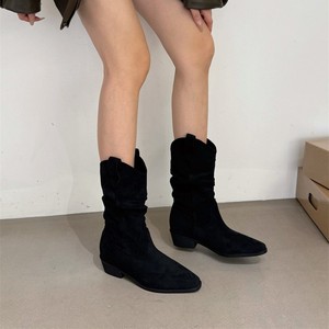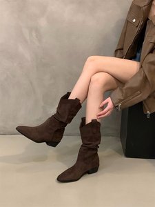 2025秋冬新款尖头短靴中筒靴套筒靴粗跟时装靴复古褶皱显瘦堆堆靴