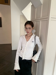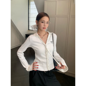 白色波点拼接polo领内搭打底衫女装秋季修身短款长袖T恤上衣跨境
