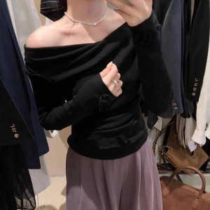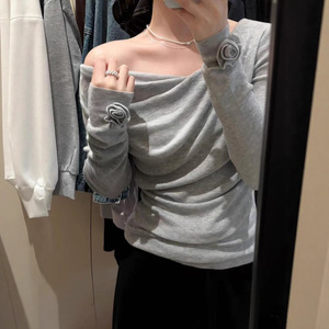 早秋白色立体花朵荡领露肩针织衫女春秋冬内搭打底衫上衣
