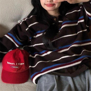 韩国百搭条纹撞色针织衫女秋冬新款宽松慵懒风复古polo领套头毛衣