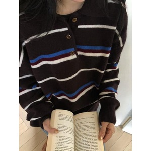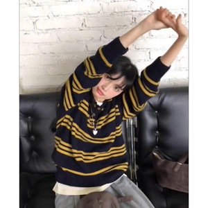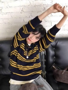 早秋新款韩系设计感复古撞色条纹减龄休闲针织毛衣女
