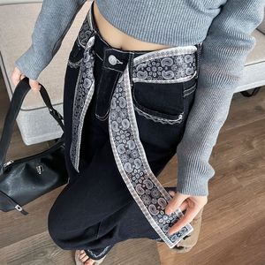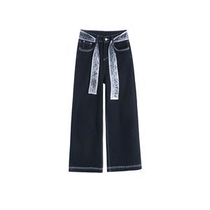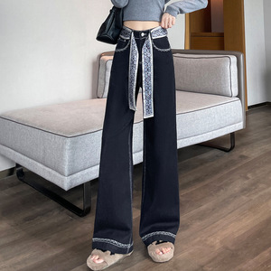 刺绣丹宁蓝牛仔阔腿裤女2025秋季新款丝巾高腰显瘦宽松遮肉直筒裤