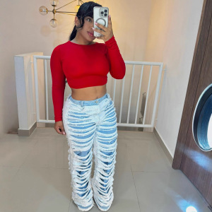 欧美女式直筒牛仔裤亚马逊跨境外贸女装时尚双层洗水磨破休闲长裤
