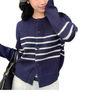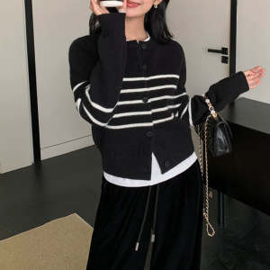 早秋新款休闲简约圆领针织开衫女韩版撞色条纹宽松显瘦毛衣外套