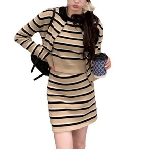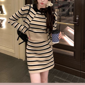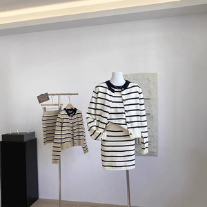 法式条纹针织开衫套装女2025秋季新款小香风开衫短群上衣三件套