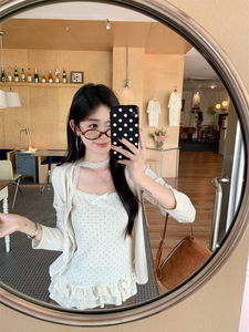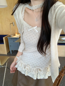 韩系甜美套装开衫短款小外套女秋季荷叶边飘带波点吊带背心两件套