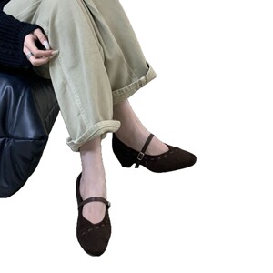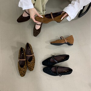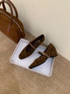 2025秋季新款粗跟尖头浅口豹纹单鞋女一字扣绒面玛丽珍晚晚鞋