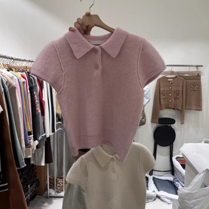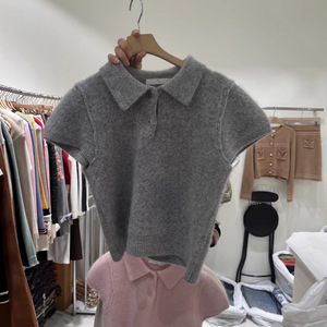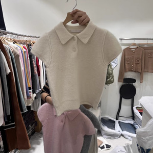 韩国东大门2025秋冬新款减龄翻领百搭短款短袖针织衫女宽松毛衣潮