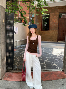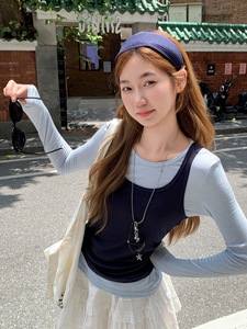 撞色长袖t恤女秋季外穿2025新款韩系叠穿吊带背心假两件修身上衣