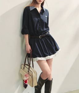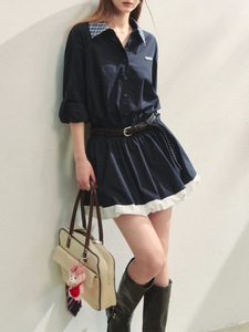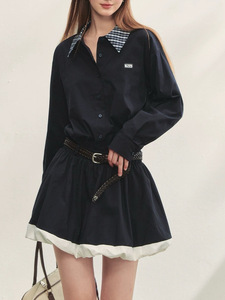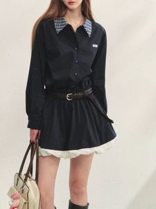格纹翻领黑色长袖连衣裙早秋学院风收腰显瘦花苞衬衫短裙
