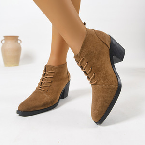 外贸2025秋季新款粗跟大码英伦风马丁靴女尖头绒面欧美中跟皮靴